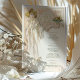 This exquisite wedding dinner menu features a stunning Art Nouveau design inspired by the works of Alphonse Mucha. The front of the menu showcases a graceful illustration of a woman presenting a dish, framed by soft earth tones of vintage green, ivory, and golden accents. The intricate details of the illustration reflect the elegance and timeless beauty of the Art Nouveau era. Perfect for couples who want to add a touch of classical artistry to their wedding, this menu offers a sophisticated presentation of your special dinner. The back features a simple yet elegant design with a nature-inspired emblem, complementing the overall vintage aesthetic.