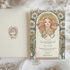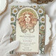 This elegant Art Nouveau wedding dinner menu draws inspiration from the iconic style of Alphonse Mucha. Featuring a graceful woman adorned with florals and intricate patterns, this menu radiates vintage charm with soft tones of beige, gold, sage green, and peach. The detailed illustration on the front is beautifully complemented by a minimalist design on the reverse, making this menu a perfect choice for couples who appreciate classical art and timeless elegance. Ideal for a vintage-themed or art-inspired wedding, this menu will add a touch of refinement to your special event.