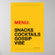 Brighten up your kitchen with humor! “MENU: SNACKS, COCKTAILS, GOSSIP & VIBES” poster in modern typography. Available in multiple color backgrounds, perfect as home decor, gifts, or kitchen wall art.