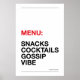 Brighten up your kitchen with humor! “MENU: SNACKS, COCKTAILS, GOSSIP & VIBES” poster in modern typography. Available in multiple color backgrounds, perfect as home decor, gifts, or kitchen wall art.