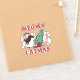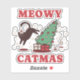 Retro style illustration with "Meowy Catmas" text design and cute black cat, Christmas tree, snowflakes, gifts, paws and stars decoration