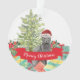 Cute dated Blue Russian Cat Christmas ornament with a christmas tree & wrapped gifts with the holiday message "Meowy Christmas" . Visit our shop to view a large assortment of cat breads