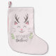 Cute vector illustration of a cat with antlers smiling. Beneath the kitty it says "Meowy Christmas." Fun and joyful pink xmas stocking for cat owners and lovers!