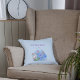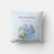 A customisable nursery throw pillow in blue theme with an undersea illustration of a mercat (mermaid cat) with fishes, jellyfish, seahorse. You can customise both the name and date.