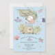 A watercolor and illustrated mermaid themed 1st birthday party invitation. Mermaid hugging starfish overlay on a watercolor background with creatures of the sea surrounding her. A cute artistic whimsical style invite. Blue on the back of the invite.
