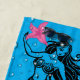 Beach towel with two silhouettes of mermaids each holding a pink starfish against a blue background with bubbles.
