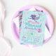 This purple, pink, teal and gold mermaid invitation is perfect for your under the sea celebration! Customise with your details to create a one of a kind birthday mermaid tail invite!