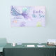 Watercolor pastel purple and blue hues, featuring playful mermaid tail, clown fish, and corals.