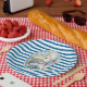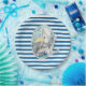 Bright blue and white horizontal pattern design paper plates with a mermaid and anchor.