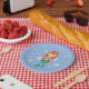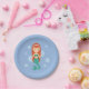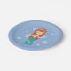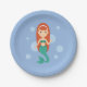 Ocean sealife, mermaid in underwater background. Summer birthday party paper plate with air bubbles in the sea and siren girl with red hair waving.