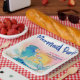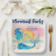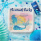 Whimsical mermaid themed girl's birthday party paper plates feature a "Mermaid Party" caption and a watercolor mermaid sitting on the the beach between two starfish while enjoying a tray of cupcakes and a tropical sunset. Perfect for "Under the Sea", nautical and beach theme celebrations. Art by KL Stock