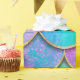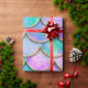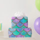 Mermaid fish scale wave japanese seamless pattern. Watercolor hand drawn teal purple golden background. Watercolour scales shaped texture. Paper cut style, 3d effect.