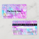 This is the perfect gift certificate business card for a trendy, stylish, girly, and modern businesswoman. This glamourous and chic design features faux printed sparkly mermaid colour glitter drips on top of a holographic iridescent foil background. The typography is an elegant cursive script with a modern serif font to match. The colour scheme includes pink, aqua blue, and magenta purple. It's chic, pretty, unique, and luxurious; the perfect way to advertise your business and stylise your marketing and advertisement material for your customers, while at the same time giving them a way to gift to their friends and family.
