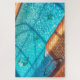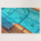 There’s a mermaid in the swimming pool, along with a few other sea creatures on this Jigsaw Puzzle. The original photograph by ZoeSPEAK is an overhead view of an aqua blue pool edged with marine blue and terracotta tile, and a curvy steel railing. The afternoon sunlight throws shadows on the sparkling water. The mermaid is happy.