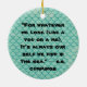 Round ornament with an image of a mermaid in the sea on the front and a line from a poem by e.e. cummings on the back.