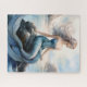 Jigsaw puzzle of a serene mermaid with long flowing hair sitting gracefully on a rock surrounded by calm ocean waters and distant cliffs. Soft pastel colours enhance the tranquil and magical atmosphere of the scene.