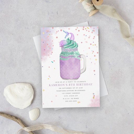 Illustration of a pink mermaid themed milkshake in a mason jar topped with whipped cream, sprinkles, and mermaid fin with seashell, starfish, and pearl confetti.