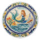 summery sicilian,italian hand painted decorative,mediterranean mermaid portuguese design,"blue marine ocean sea", "mythical mythological fairytale mermaids", "colourful blue and yellow" ,authentic classic traditional painting,vintage spring antique rustic,folk art spanish mexican talavera,"green waves circle border"