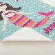 This adorable mermaid throw features a brunette mermaid with multi-coloured shell striped pattern tail in orange, fuchsia, light pink, and aqua. She is wearing a dark pink bikini top and has a pink floral headband on. She is swimming in a sea of aqua blue and white waves, with pink and orange starfish and seaweed accents. The sherpa throw is also personalised with a name that can be removed or changed to say whatever you want.
