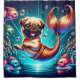 Dive into the enchanting world of this precious illustration featuring an adorable pug puppy mermaid and her cute little fish friends. The pug mermaid has a cute, expressive face and shimmering scales in hues of copper and gold. The underwater backdrop includes vibrant coral, sea plants, and bubbles, creating a magical and whimsical scene. Perfect for children’s decor, mermaid lovers, or pug enthusiasts of any age, this design captures the playful charm of a mermaid puppy in a vibrant and captivating way.