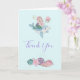 Thank you card with an adorable illustration. Designed with a pretty mermaid girl riding a happy dolphin. A little jellyfish friend accompanies them. Decorated with little splatters of faux gold glitter. Seashells and a starfish along the bottom. Light blue background.
