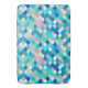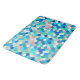 Bathmat in a pattern of fantasy mermaid scales, in sea glass-inspired colours of aqua, shell pink, turquoise, seafoam green, and cobalt blue