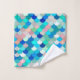 Towel set in a pattern of fantasy mermaid scales, in sea glass-inspired colours of aqua, shell pink, turquoise, seafoam green, and cobalt blue