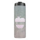 A thermal tumbler for teachers featuring an illustration of an apple with a purple mermaid scales inspired pattern. Background is ocean water. Personalise the name.