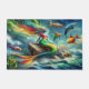 abstract oil painted look with a picture of a a mermaid topical fin in red and green top sitting on a rock with the ocean and five other colourful topical fish and whales and seals around her with a blue sky.green seaweed floating . This design features brilliant gold lightning colours and powerful pose .with paint drips on it