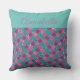 This colourful and enchanting custom throw pillow features a mermaid tail design. The top portion features a teal, aquamarine colour. The bottom portion features a teal, purple, and pink glitter mermaid tail pattern. A sample child's name is printed in a purple font over the top portion.