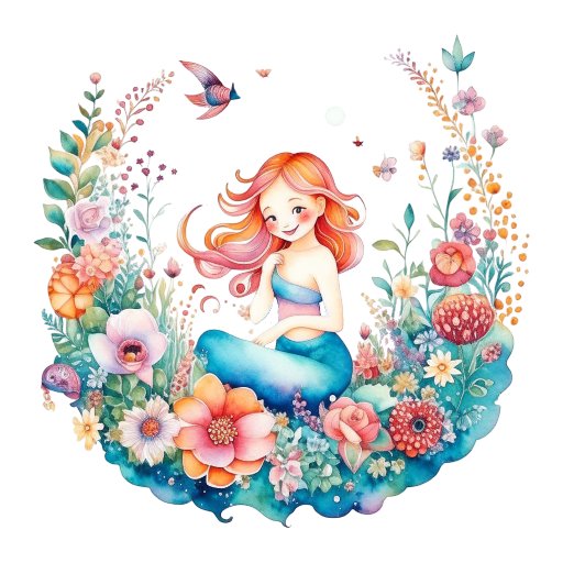 A pretty little mermaid in a bed of flowers watercolor illustration girl's personalised birthday girl button. Colours used are pink, coral, orange, yellow and blue.