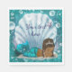 Mermaid under the sea paper napkins with adorable African American mermaid baby in a pretty clam shell on a beautiful teal blue background. You can add text in the font style and colour of your choice to personalise for your event. This is a printed design with no real jewels, glitter, etc.