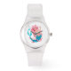 Illustration of a smiling white mermaid, around 23 years old, with long pink hair, blue eyes, and fair skin. She wears a coral crown, a pearl necklace, and blue seashell bra cups. Her tail is blue with pink highlights. She is waving with both hands. The background is white. The style is digital art.
