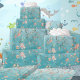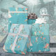 A watercolor painted children's wrapping paper in bright turquoise and orange featuring mermaids and seahorses gathered for a party in an underwater world.