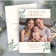 Lovely and fresh christmas holiday greeting card. This modern and youthful design features a set of contemporary fonts, a photo and customisable text at the front and back of the card. The backgrounds both at the front and back are white with accents of fresh young greenery. Customise and personalise to make it your very own.