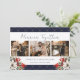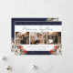 Elegant blue 3 photo newlywed Christmas card featuring winter botanicals consisting of holly, red berries, poinsettia and conifer tree branches. Easily personalize this blue photo holiday card with your photos and text. The background can be personalized to any color.