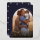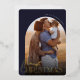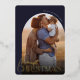Our festive and elegant holiday card design with a unique arched layout is the perfect way to show off your favourite vertical or portrait orientated family photo. Design features "Merriest Christmas" in shining gold foil typography and hand lettered script, with your family name curved over the top of the photo. Cards reverse to a white winter snowflake pattern.