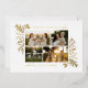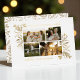 Merriest Christmas Wishes 4 Photo Botanical Floral Foil Holiday Card Foil Christmas Card features your favourite photo on the front with the text "Merriest Christmas Wishes" in modern gold calligraphy script typography on a white background and personalised with your family name below. On the reverse is an elegant gold botanical pattern. Perfect to send to family and friends for Christmas and the holidays. Created by Evco Studio www.zazzle.com/store/evcostudio