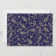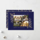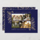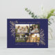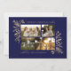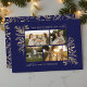 Merriest Christmas Wishes 4 Photo Botanical Floral Holiday Card Christmas Card features your favourite photo on the front with the text "Merriest Christmas Wishes" in modern gold calligraphy script typography on a blue background and personalised with your family name below. On the reverse is an elegant gold botanical pattern. Perfect to send to family and friends for Christmas and the holidays. Created by Evco Studio www.zazzle.com/store/evcostudio
