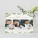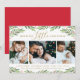 Elegant "Merriest Little Christmas" birth announcement holiday card includes a collage of three photo spaces and custom antique gold text that can be personalised to announce the arrival of your new baby boy or girl. Includes a white background with green watercolor painted greenery sprigs and red berries. This design is perfect for a family with small children or a new baby.