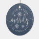 Personalise this stylish holiday ornament with your names and the year for a chic way to commemorate your first married Christmas! Perfect for newlyweds, round ornament features "merrily ever after" in a mix of white calligraphy script and block typefaces, accented with white snowflakes on a rich slate blue background. Add your favourite wedding photo to the reverse side.