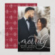 Elegant holiday photo cards for newlyweds feature a favourite vertical or portrait orientated wedding photo with "Merrily Ever After" overlaid in white calligraphy script. Personalise with your names or custom greeting beneath. A subtle and modern snowflake pattern on the reverse side completes the look. Perfect for sharing a wedding photo for your first married Christmas.