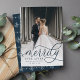 Elegant holiday photo cards for newlyweds feature a favourite vertical or portrait orientated wedding photo with "Merrily Ever After" overlaid in rich jewel toned calligraphy script. Personalise with your names or custom greeting beneath. A subtle and modern snowflake pattern on the reverse side completes the look. Perfect for sharing a wedding photo for your first married Christmas.