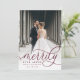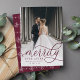 Elegant holiday photo cards for newlyweds feature a favourite vertical or portrait orientated wedding photo with "Merrily Ever After" overlaid in rich jewel toned burgundy plum calligraphy script. Personalise with your names or custom greeting beneath. A subtle and modern snowflake pattern on the reverse side completes the look. Perfect for sharing a wedding photo for your first married Christmas.
