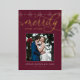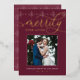 Elegant holiday photo cards for newlyweds feature a favourite square wedding photo on a rich burgundy plum background, with "Merrily Ever After" in luxe gold foil calligraphy script. Personalise with your names or custom greeting beneath. A tonal snowflake border completes the look. Perfect for sharing a wedding photo for your first married Christmas.