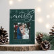 Elegant holiday photo cards for newlyweds feature a favourite square wedding photo on a rich hunter green background, with "Merrily Ever After" in white calligraphy script. Personalise with your names or custom greeting beneath. A tonal snowflake border completes the look. Perfect for sharing a wedding photo for your first married Christmas.