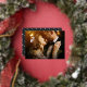 Chic holiday photo card for newlyweds features your favourite horizontal or landscape orientated wedding photo with "merrily ever after" overlaid in gold foil script lettering. Personalise with your names and the year beneath.