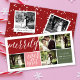 This modern minimalist holiday/christmas wedding announcement card features the word 'Merrily Ever After' in a simple and trendy white handwriting script calligraphy on red, pink and green colour blocks with 4 photo collage.