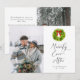 Rustic and modern wedding announcement card for the holiday season featuring a watercolor illustration of a Christmas wreath with a red bow. The text says "Merrily Ever After." You can add a 2nd picture on the back of the card along with your message. Perfect Christmas wedding announcement card!