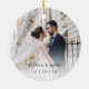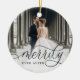 Elegant holiday photo ornament for newlyweds features a favourite wedding photo on each side, with "Merrily Ever After" overlaid in chic calligraphy script. Personalise with your names and wedding date on the back.